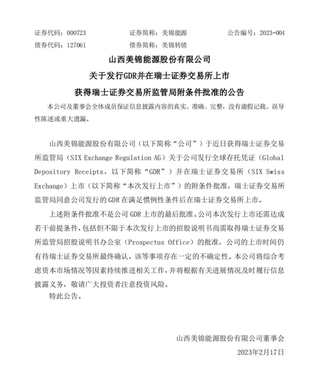 近日,美錦能源獲得瑞士證券交易所監管局關于公司發行全球存托憑證(GDR)并在瑞士證券交易所上市的附條件批準,瑞士證券交易所監管局同意公司發行的GDR在滿足慣例性條件后在瑞士證券交易所上市。