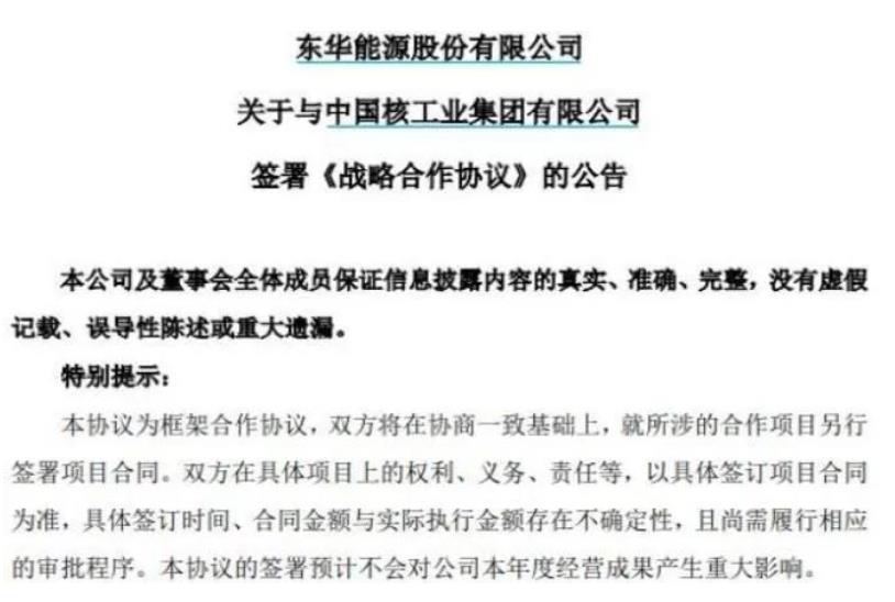 9月6日晚,東華能源發(fā)布公告,與中核集團簽署《戰(zhàn)略合作協(xié)議》,協(xié)議有效期為10年,雙方將在未來五年內(nèi)預計投資超千億元共同打造零碳產(chǎn)業(yè)園,并聯(lián)合成立氫能聯(lián)盟。