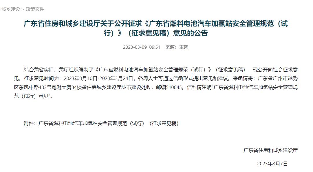 氫啟未來網獲悉,3月9日,廣東省住房和城鄉建設廳印發關于公開征求《廣東省燃料電池汽車加氫站安全管理規范(試行)》(征求意見稿)意見的公告