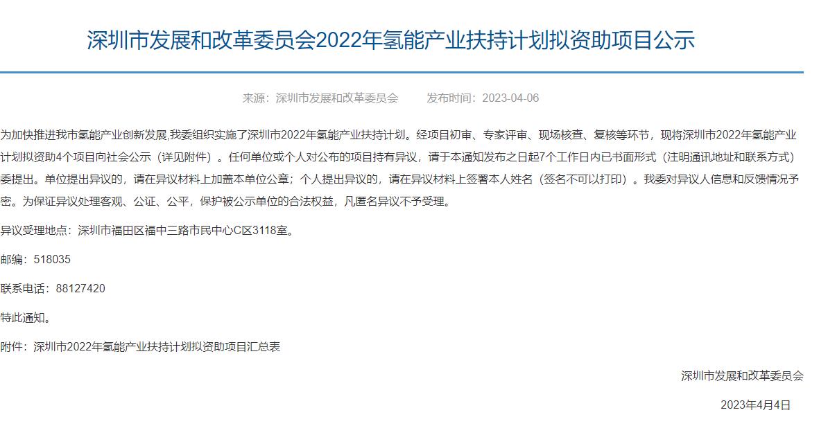 氫啟未來網獲悉,4月6日,深圳市發展和改革委員會發布2022年氫能產業扶持計劃擬資助項目公示。