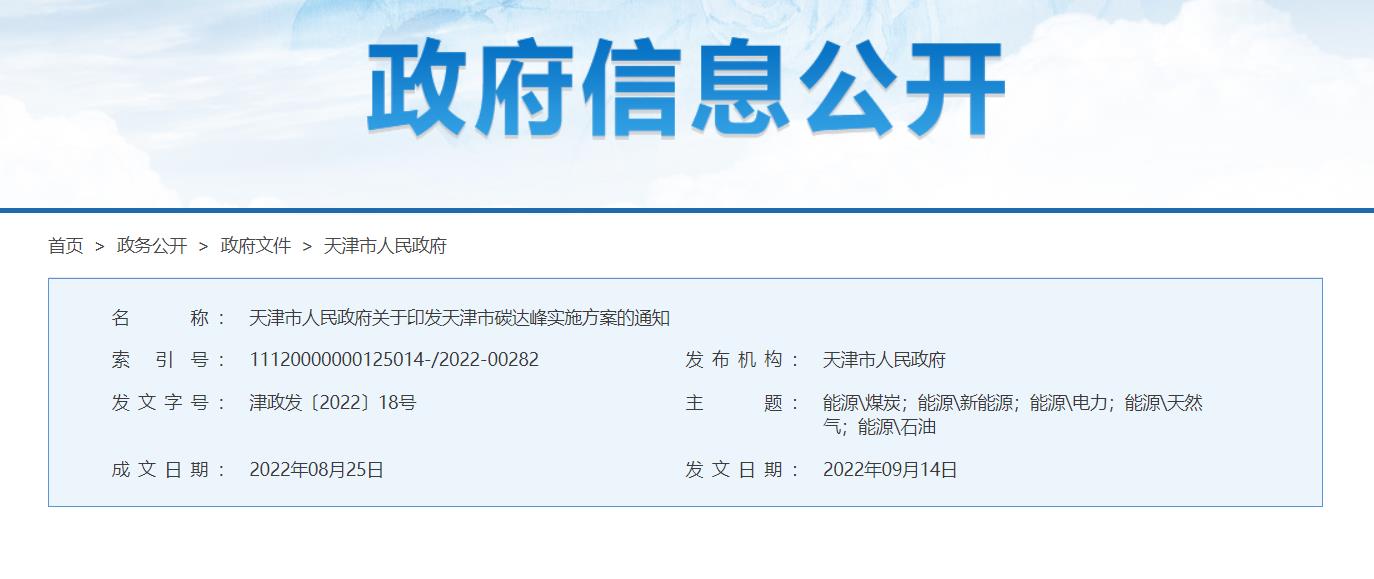 近日,天津市人民政府印發了《天津市碳達峰實施方案》的通知