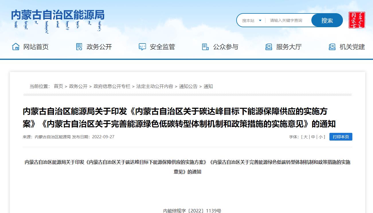 9月27日,內蒙古自治區能源局發布關于印發《內蒙古自治區關于碳達峰目標下能源保障供應的實施方案》《內蒙古自治區關于完善能源綠色低碳轉型體制機制和政策措施的實施意見》的通知。