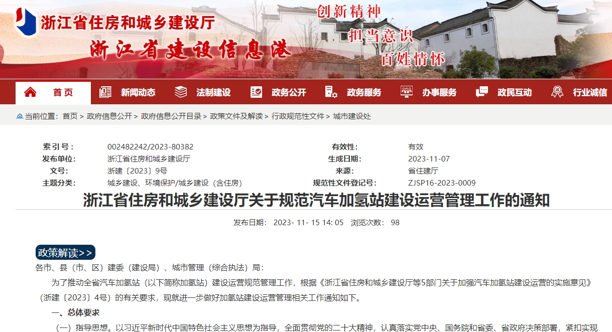 11月15日,為了推動(dòng)浙江省汽車加氫站建設(shè)運(yùn)營規(guī)范管理工作,根據(jù)《浙江省住房和城鄉(xiāng)建設(shè)廳等5部門關(guān)于加強(qiáng)汽車加氫站建設(shè)運(yùn)營的實(shí)施意見》(浙建〔2023〕4號)的有關(guān)要求,浙江省住房和城鄉(xiāng)建設(shè)廳在其官方發(fā)布了《浙江省住房和城鄉(xiāng)建設(shè)廳關(guān)于規(guī)范汽車加氫站建設(shè)運(yùn)營管理工作的通知》