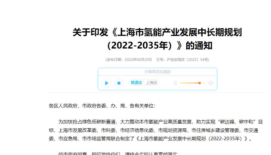 氫啟未來網6月20日消息,為加快搶占綠色低碳新賽道,大力推動本市氫能產業高質量發展,助力實現“碳達峰、碳中和”目標,近日,上海市發展改革委、市科委、市經濟信息化委、市規劃資源局、市住房城鄉建設管理委、市交通委、市應急局、市市場監管局聯合制定的《上海市氫能產業發展中長期規劃(2022-2035年)》已印發。