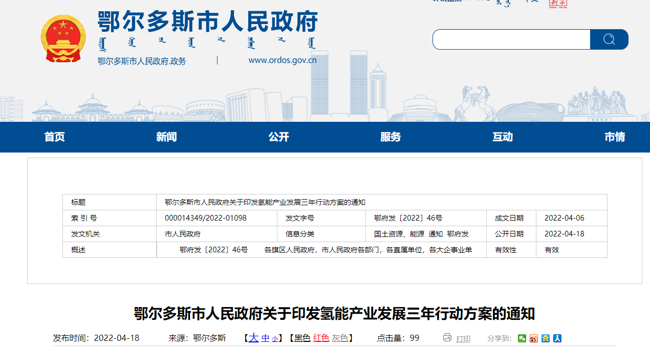 4月18日,鄂爾多斯市人民政府發(fā)布了《關(guān)于印發(fā)氫能產(chǎn)業(yè)發(fā)展三年行動(dòng)方案的通知》。到2024年,開展可再生能源制氫示范項(xiàng)目8個(gè)以上,通過示范推廣、產(chǎn)業(yè)培育和技術(shù)攻關(guān),實(shí)現(xiàn)鄂爾多斯市氫能裝備產(chǎn)業(yè)及綜合應(yīng)用突破性發(fā)展。至2024年,鄂爾多斯市可再生氫產(chǎn)量達(dá)20萬噸/每年。至2024年,累計(jì)建設(shè)加氫站60座,燃料電池車輛推廣超過3000輛,打造5個(gè)以上10萬噸級綠色化工項(xiàng)目。