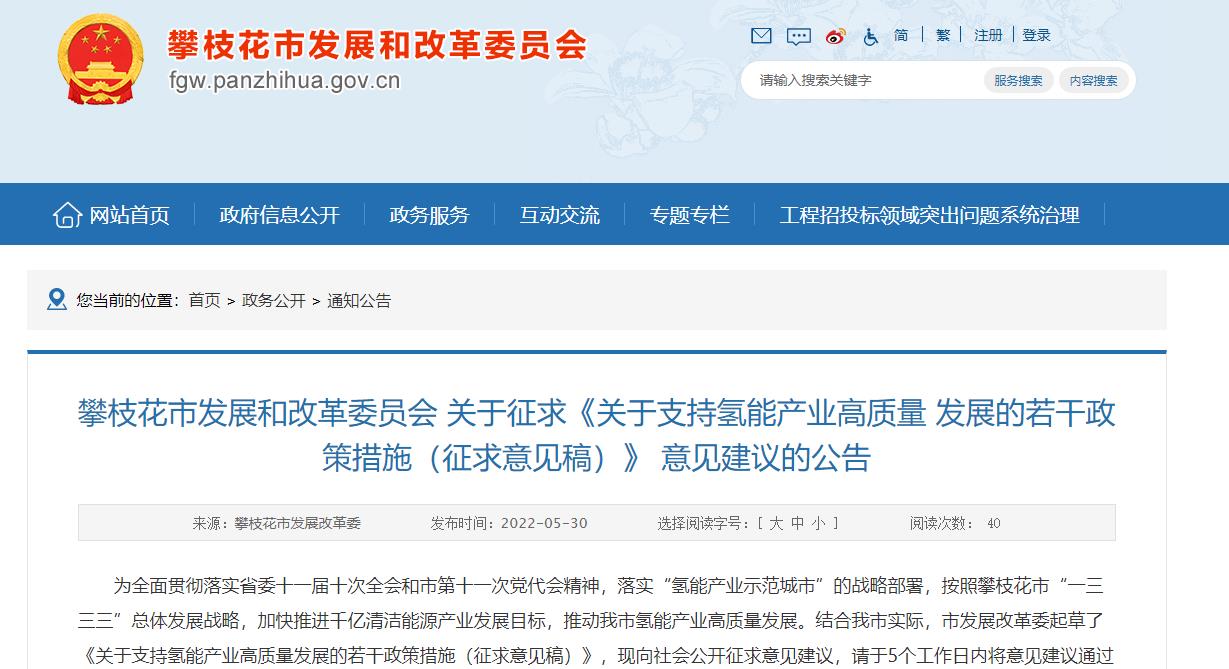 攀枝花市發(fā)展和改革委員會(huì) 關(guān)于征求《關(guān)于支持氫能產(chǎn)業(yè)高質(zhì)量 發(fā)展的若干政策措施(征求意見稿)》 意見建議的公告