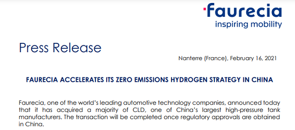 ?2月16日,佛吉亞(FAURECIA)宣布已收購中國最大高壓氣瓶公司斯林達(CLD)大部分股權,交易將在獲得相關部門審批后完成。截止目前,雙方并未透露具體的收購金額。根據了解,此次收購為絕對控股,雙方將為中國市場開發生產III型和IV型儲氫罐。