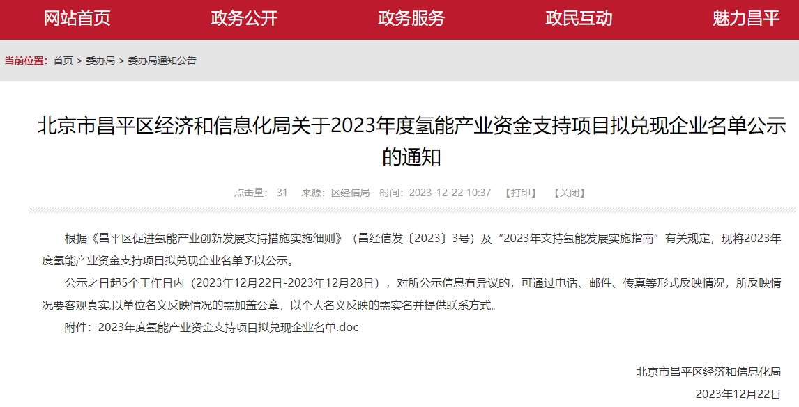 22家企業(yè)!北京昌平“2023年度氫能產(chǎn)業(yè)資金支持項(xiàng)目擬兌現(xiàn)企業(yè)名單公示”