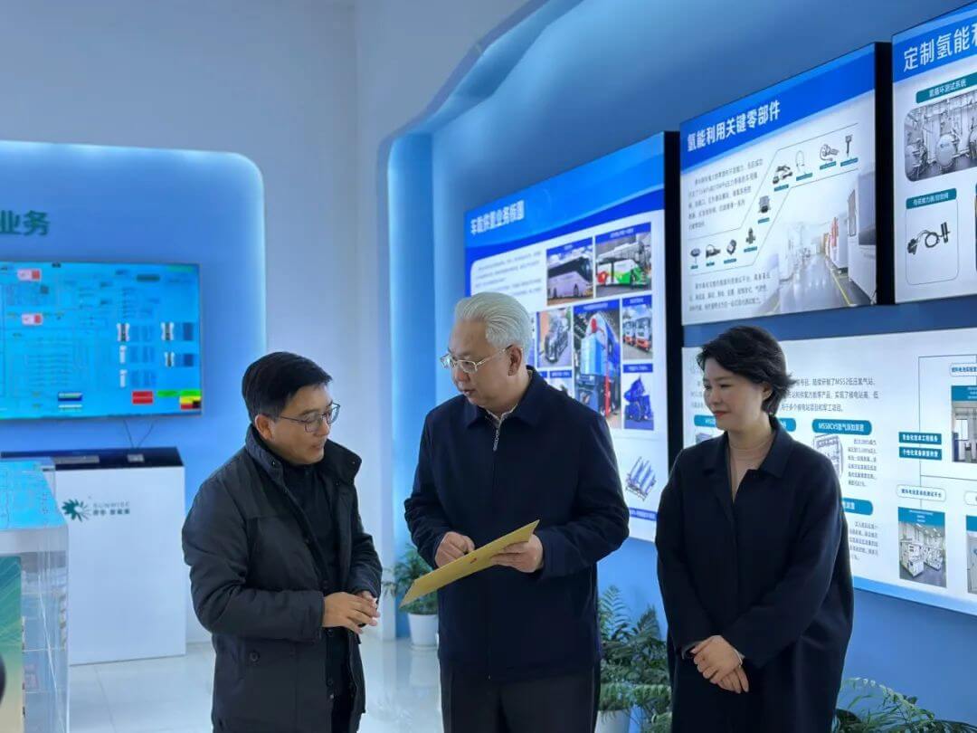 11月13日,江陰市政府副市長陳涵杰、江陰市政協副主席、商務局局長時平等領導一行蒞臨穩石氫能走訪調研,此次調研旨在促進項目產業落地,推動江陰市的可持續發展和能源轉型。穩石氫能董事長賈力攜團隊熱情接待并陪同參觀。