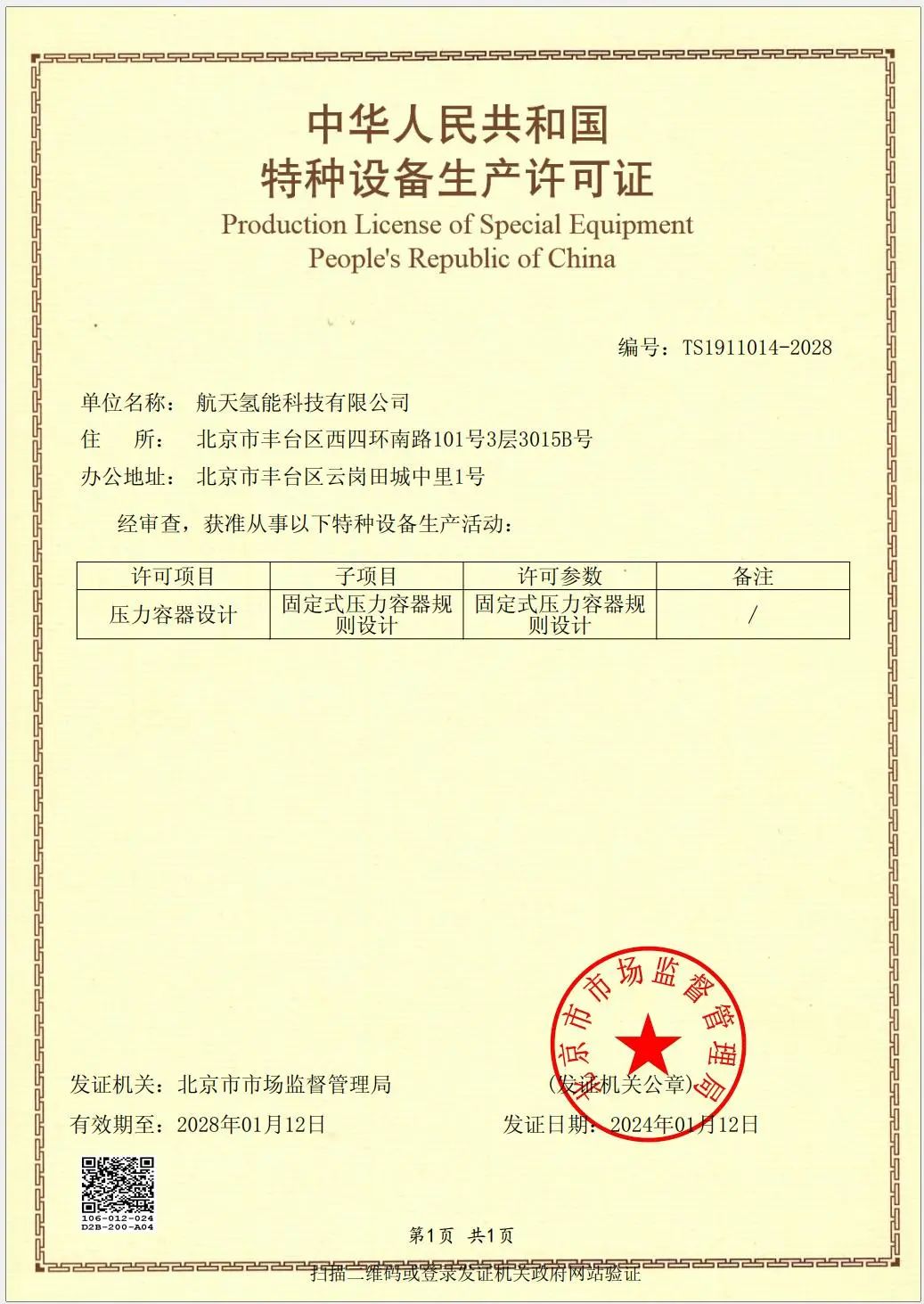 航天氫能科技有限公司順利取得“壓力容器設(shè)計-固定式壓力容器規(guī)則設(shè)計”許可證