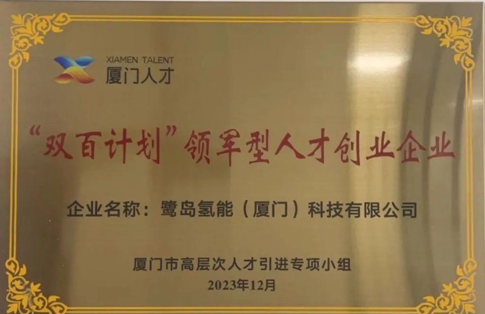鷺島氫能榮獲廈門市“雙百計劃”領(lǐng)軍型人才創(chuàng)業(yè)企業(yè)稱號