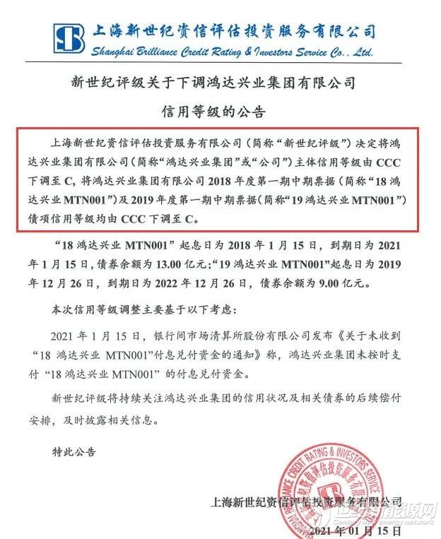 受此影響,上海新世紀資信評估投資服務有限公司于1月14日和1月19日兩次下調鴻達興業集團主體的債項信用等級,由BB降至C。根據新世紀評級官網給出的等級定義,C級屬于“投機級”,意為“不能償還債務”。
