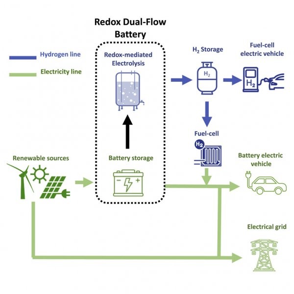 為了創(chuàng)造這個系統(tǒng),LEPA的科學(xué)家們采用了一個傳統(tǒng)的氧化還原流電池,并通過添加兩個催化反應(yīng)器來增強(qiáng)它。這些反應(yīng)堆從罐內(nèi)循環(huán)的流體中產(chǎn)生氫氣。雷納德說:“氫是通過催化過程產(chǎn)生的,利用電池的能量將水分子分解成氫和氧的成分。”但這種氫只有在充電的能源是可再生的情況下才能被認(rèn)為是清潔的。”