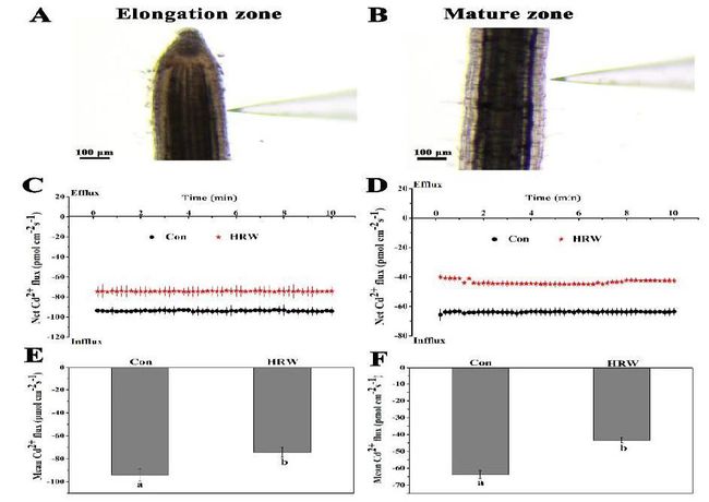 圖1. 50 μM Cd處理下HRW預(yù)處理對(duì)小白菜根部伸長區(qū)(A, C, E)和成熟區(qū)(B, D, F)Cd2+流速的影響