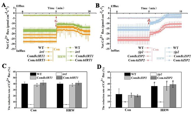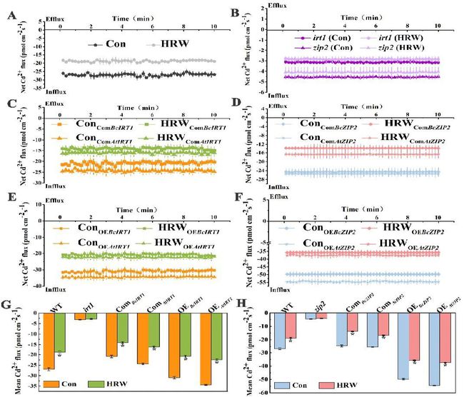 通過Cd(鎘)濃度,Cd2+熒光染色,NMT(非損傷微測(cè)技術(shù))對(duì)Cd吸收進(jìn)行分析,結(jié)果表明,HRW(hydrogen-rich water,富氫水)在降低小白菜幼苗根部對(duì)Cd的吸收方面具有顯著的積極作用。BcIRT1(鐵調(diào)節(jié)轉(zhuǎn)運(yùn)蛋白1)和BcZIP2(鋅調(diào)節(jié)轉(zhuǎn)運(yùn)蛋白2)是小白菜中主要的Cd轉(zhuǎn)運(yùn)蛋白,但它們?cè)贖RW減少Cd吸收過程中的作用仍然未知。本研究驗(yàn)證了IRT1和ZIP2在白菜和擬南芥中HRW減少Cd吸收中的功能。在擬南芥中的異源和同源表達(dá)表明,HRW顯著降低了野生型(Col-0)和轉(zhuǎn)基因擬南芥IRT1和ZIP2中的Cd含量,但irt1和zip2突變體除外。NMT檢測(cè)表明,HRW不僅降低了Cd2+在WT和轉(zhuǎn)基因株系根部的內(nèi)流,而且增強(qiáng)了Zn和Cd之間的競爭。綜合來看,HRW誘導(dǎo)的植物Cd積累減少可能是通過抑制BcIRT1和BcZIP2的表達(dá),影響B(tài)cIRT1和BcZIP2對(duì)離子吸收的偏好性導(dǎo)致的。