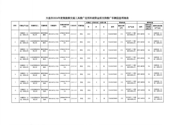 近日,大連市工業(yè)和信息化局公示了2024年度氫能源交通工具推廣應用補助資金申報項目。共有63輛氫車入選,詳情如下: