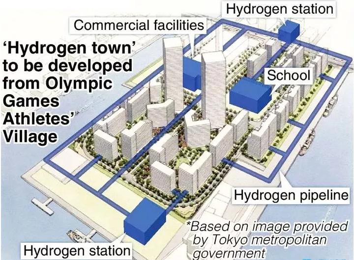 圖中展示的2020年東京奧運(yùn)會(huì)選手村,是日本第一個(gè)氫能社區(qū),計(jì)劃于10月份基本建成,屆時(shí)也將是世界上第一個(gè)氫能源社區(qū)。這里的5000多戶住宅全部采用家用氫能源燃料電池作為家庭基本電源。同時(shí)該社區(qū)內(nèi)還建有一個(gè)大型的加氫站和氫氣管線管控中心,通過管線直接將氫氣輸入到各戶家庭的燃料電池中,使得燃料電池成為永久性的發(fā)電系統(tǒng)。另外,社區(qū)內(nèi)的所有商業(yè)設(shè)施、巡回巴士、路燈等的用電,也將由氫能源提供。