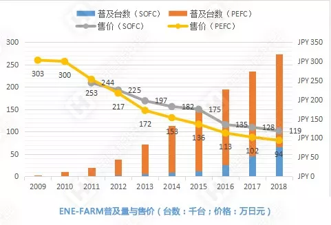 據(jù)悉,到今年3月為止,日本已經(jīng)有23萬戶人家安裝了氫能源燃料電池(PEFC)。氫能源電池的價(jià)格,也由當(dāng)初的300萬日元/臺(tái)降至95萬日元/臺(tái)(約6萬元人民幣)。日本政府計(jì)劃在2030年,讓氫能源燃料電池走進(jìn)530萬戶人家,使得全國有20%的家庭用上氫能源。