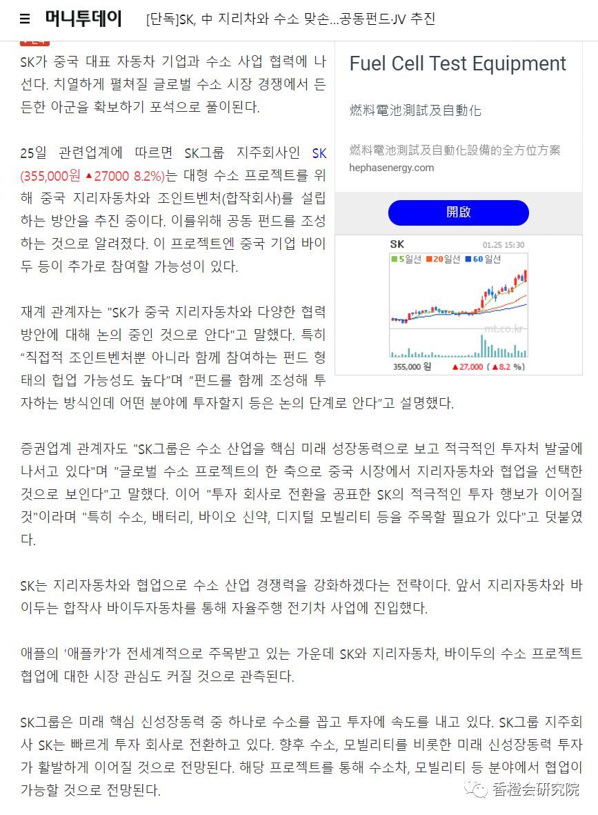 韓國(guó)SK集團(tuán)聯(lián)手吉利、百度洽談氫能業(yè)務(wù)合作
