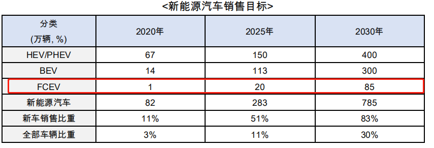 規(guī)劃目標提出,2025年新能源汽車累計銷量283萬輛,其中FCEV銷售20萬輛;2030年新能源汽車累計銷量785萬輛,其中FCEV銷售85萬輛。