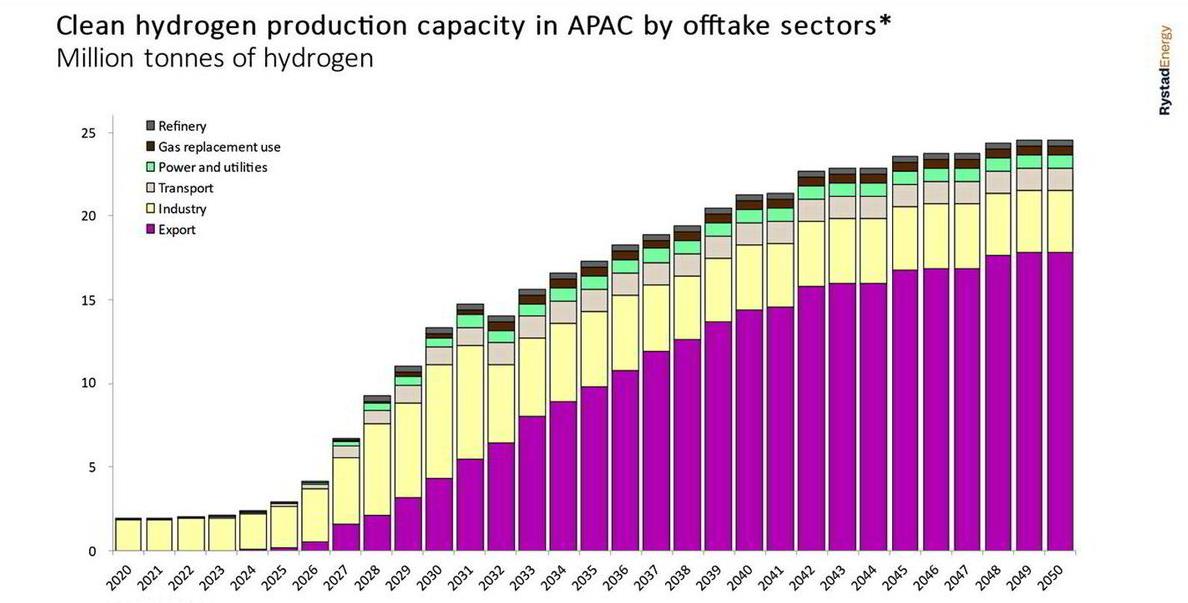 到2030年,該地區擬建的主要綠氫項目中,近一半的產能將以出口為重點,而到2050年,這一數字將接近四分之三。Le解釋說,這是由于出口項目的財務壓力增加,以實現更大的規模經濟(由于運輸H2的成本增加),并確保可靠的承購商。
