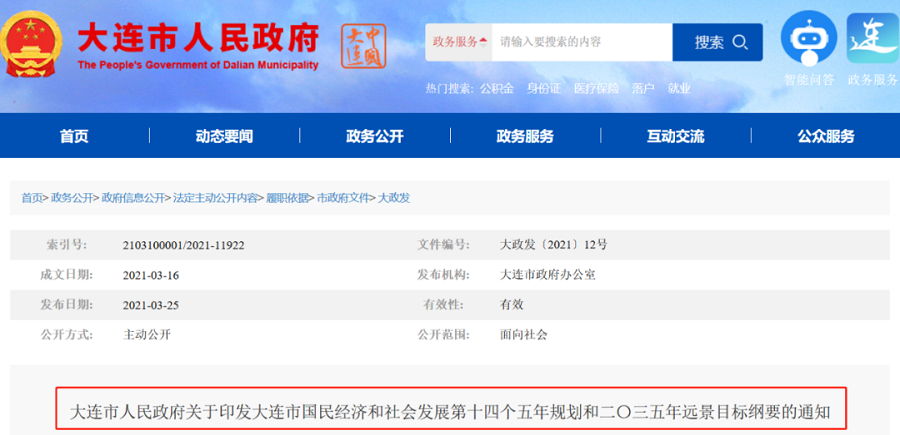 近日,大連市人民政府正式印發《大連市國民經濟和社會發展第十四個五年規劃和二〇三五年遠景目標綱要》的通知。