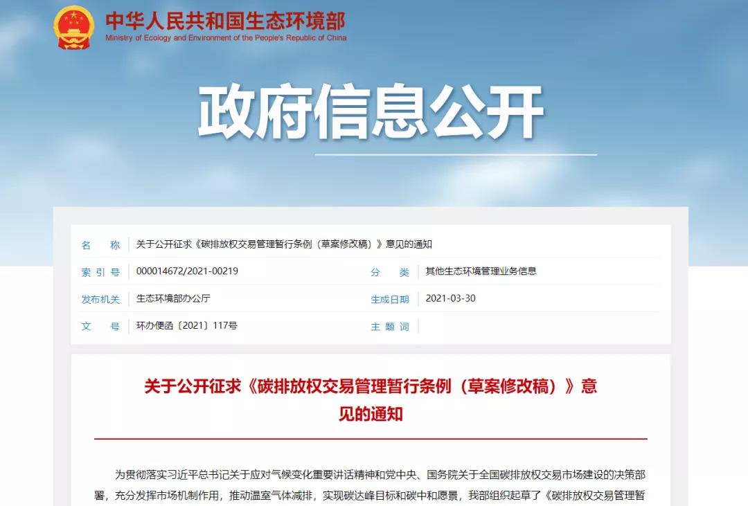 3月30日,生態(tài)環(huán)境部發(fā)布關(guān)于公開征求《碳排放權(quán)交易管理暫行條例(草案修改稿)》意見的通知征集意見截止時間為2021年4月30日。