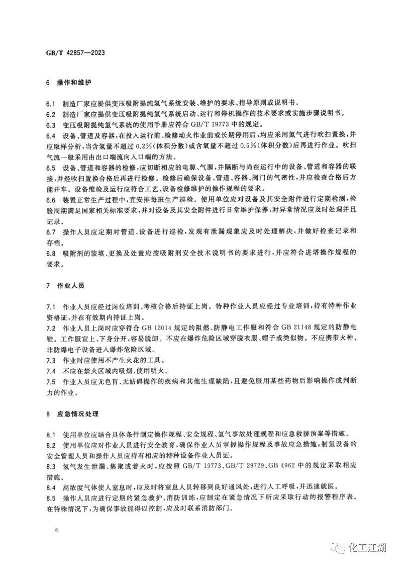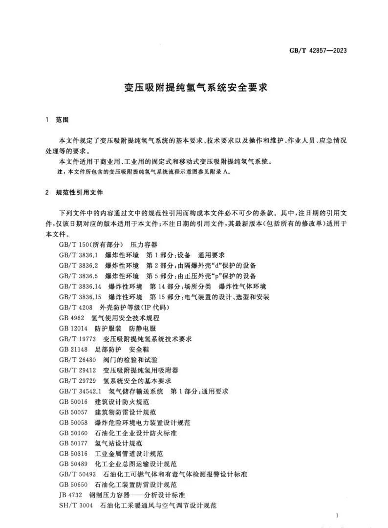 由佳安氫源參與編寫的國標《變壓吸附提純氫氣系統安全要求》與2023年12月1日正式實施,該項標準由TC309(全國氫能標準化技術委員會)歸口 。該項標準規定了變壓吸附提純氫氣系統的基本要求、技術要求以及操作和維護、作業人員、應急情況處理等的要求。本文件適用于商業用、工業用的固定式和移動式變壓吸附提純氫氣系統。