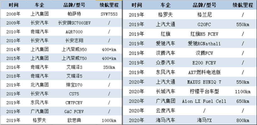 根據(jù)氫云鏈數(shù)據(jù)庫(kù)統(tǒng)計(jì)數(shù)據(jù)顯示,從2008年開(kāi)始,國(guó)內(nèi)市場(chǎng)上出現(xiàn)過(guò)的燃料電池乘用車總數(shù)大約為25款,其中登上工信部產(chǎn)品目錄的有9款。尤其是在去年新補(bǔ)貼政策推出之后,也曾一度出現(xiàn)過(guò)各個(gè)車企集中發(fā)力的情況。