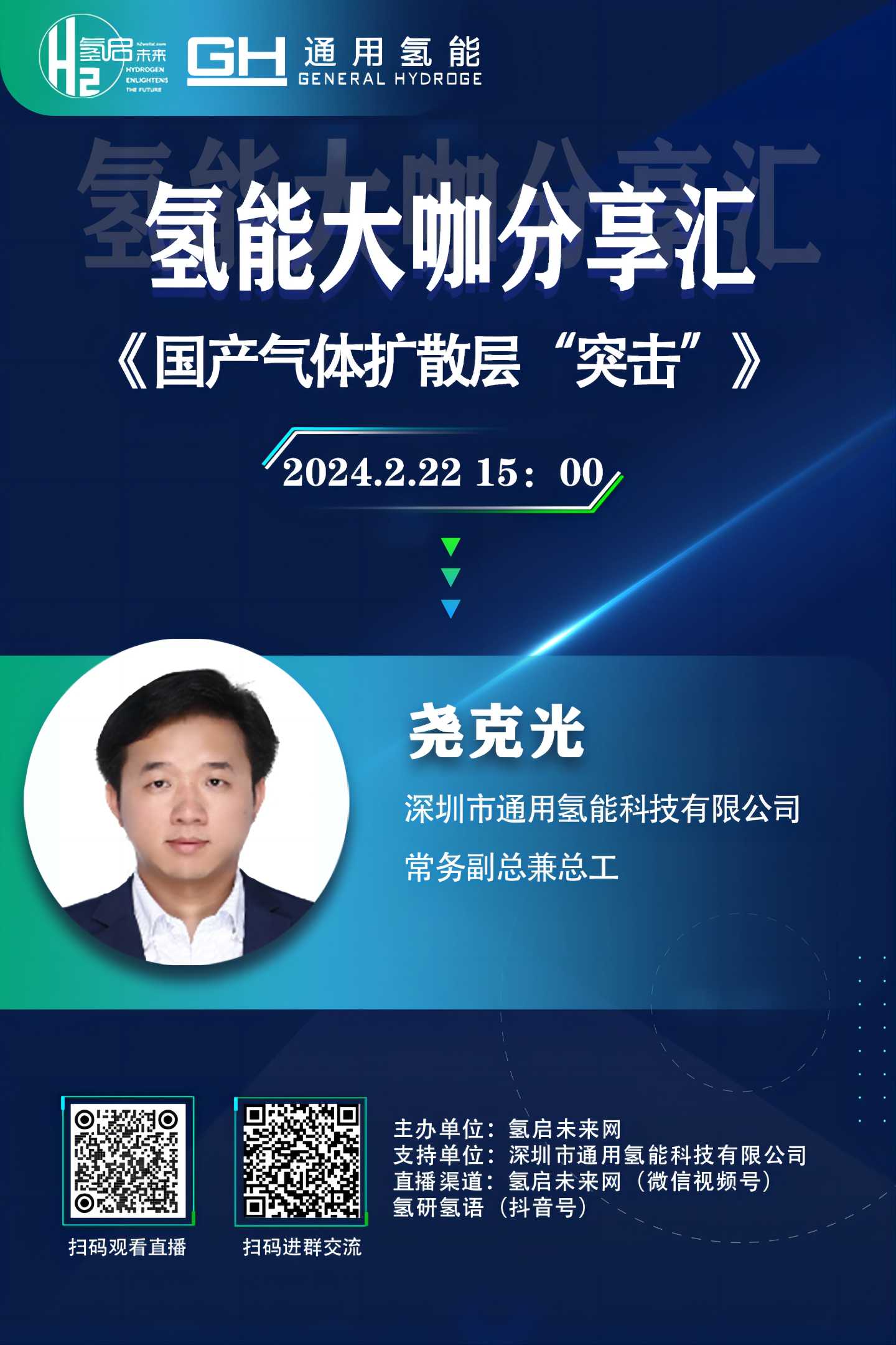 由氫啟未來網(wǎng)主辦的直播欄目《氫能大咖分享匯》即將于2月22日迎來深圳市通用氫能科技有限公司常務(wù)副總兼總工堯克光的精彩分享。