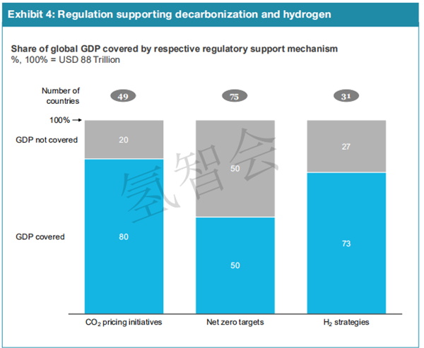 各國政府計劃支持向氫能轉型的戰略,將投入700億美元。 政府支持的增加源于全球轉向去碳化:75個國家占世界GDP的一半,凈零野心,80%的全球GDP由某種水平的二氧化碳定價機制覆蓋。