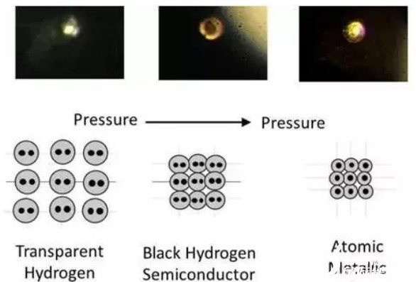 在足夠的壓力下,透明的氫分子變成黑色氫半導(dǎo)體,然后變成金屬氫原子