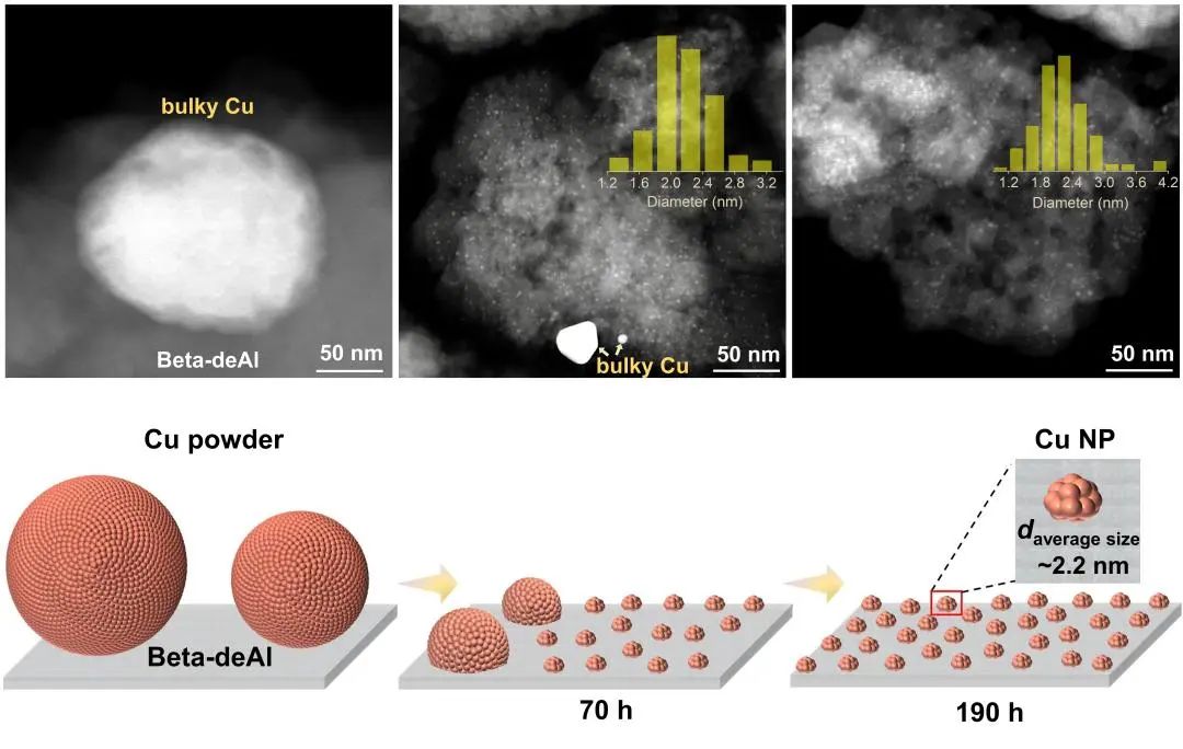 這些“坑”不是物理意義上的坑,而是化學意義上的“坑”,前期“掉”坑里的銅原子級中間體和沸石分子篩的羥基窩發生化學反應并和載體間形成強相互作用,使得整個過程的熱力學變得有利;后期大顆粒上的銅原子會繼續向這些新的成核位點遷移,并最終達到動態的平衡。這在原有催化體系中新引入了作用力,扭轉了催化劑顆粒動態演化的過程?!拔覀儾粌H切斷了顆粒變大的路徑,還順勢創造了新的成核位點,最終逆轉了該過程?!蓖趿琳f。