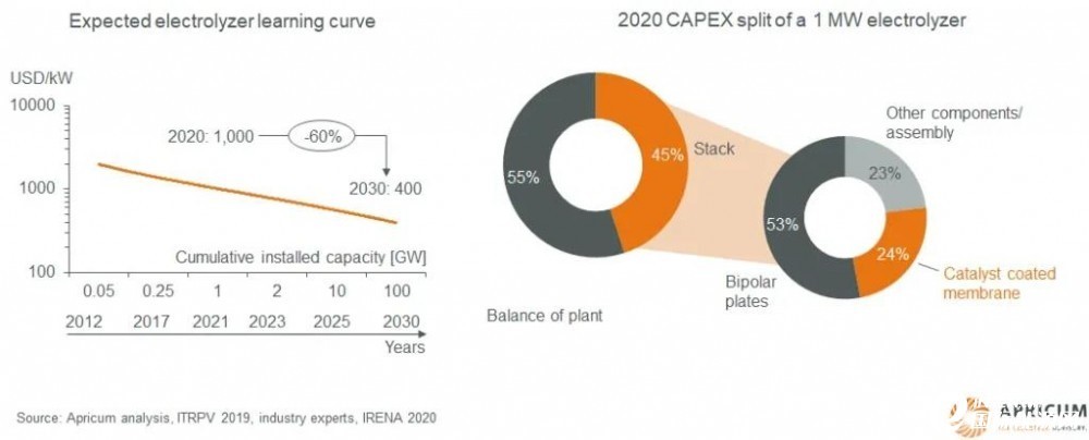 1MW電解槽的預(yù)期電解槽學(xué)習(xí)曲線和2020年資本支出分割