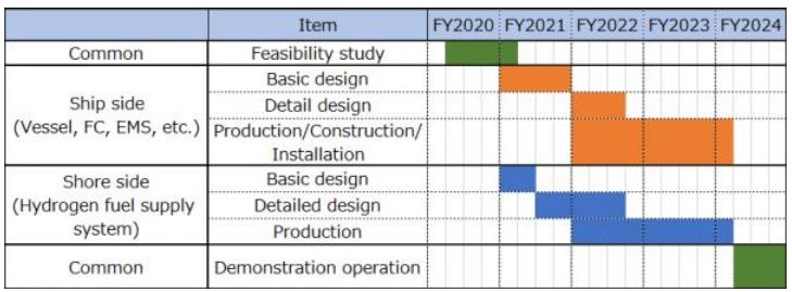 項目的目標是共同開發一艘約150噸級(即載客量約為100人)的大功率燃料電池船,它將作為一艘中型旅游船使用,并在2024年進行示范性的營運和氫燃料供應。具體計劃是:2020年9月開始燃料電池船以及氫燃料供應的可行性研究,2021年開始設計船體和氫燃料供應設備,2023年開始實際建造和生產,2024年在橫濱港口海岸試航。