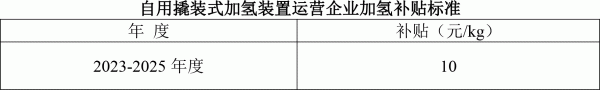 為加快推動(dòng)多種商業(yè)化場(chǎng)景應(yīng)用,解決車輛加氫不便問(wèn)題,對(duì)具有自營(yíng)業(yè)務(wù),同時(shí)符合相關(guān)安全技術(shù)規(guī)范并完成審批流程的自用撬裝式加氫裝置,按以下總額上限給予運(yùn)營(yíng)企業(yè)加氫補(bǔ)貼: