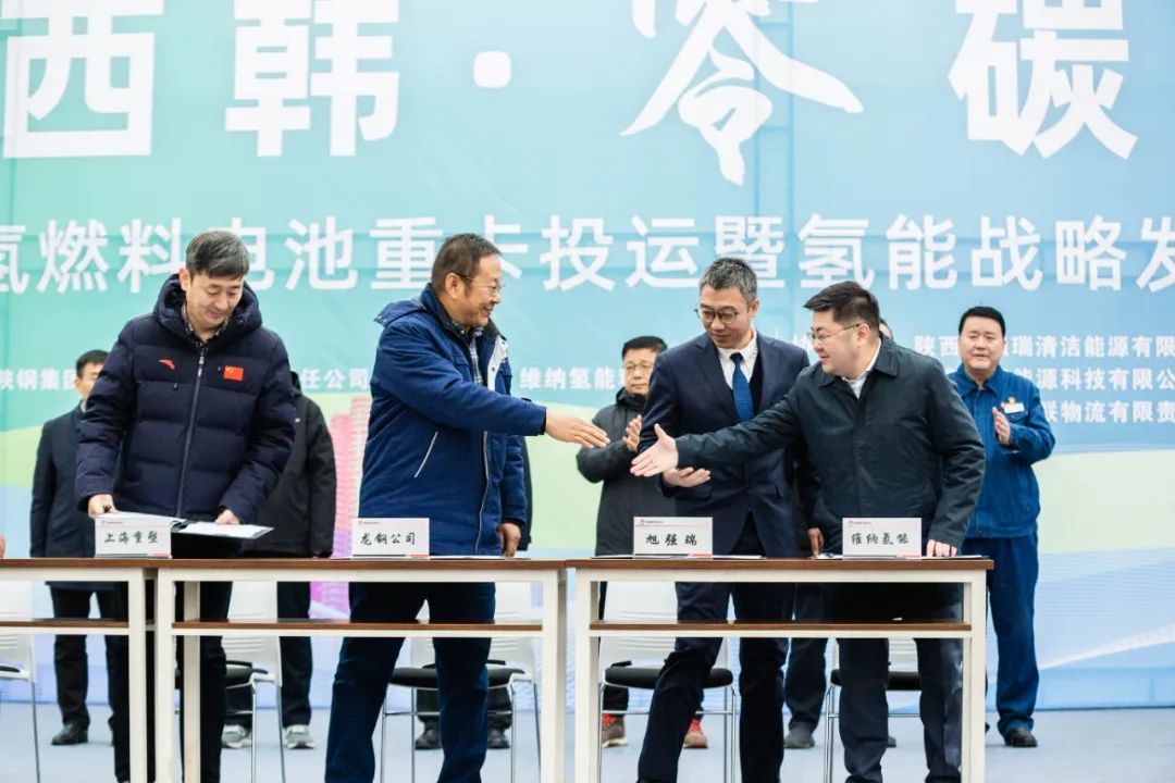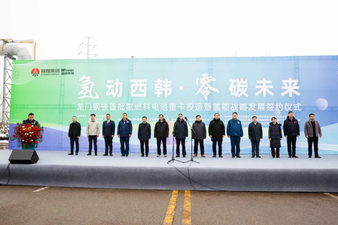 1月18日,由陜西省工業和信息化廳、陜西省能源局、韓城市人民政府指導,陜鋼集團陜西龍門鋼鐵有限責任公司(以下稱:龍鋼公司)主辦,維納氫能承辦,陜西旭強瑞清潔能源有限公司、上海重塑能源科技有限公司、北京氫璞創能科技有限公司協辦的“龍門鋼鐵首批氫燃料電池重卡投運暨氫能戰略發展簽約儀式”在韓城市龍門鋼鐵廠區成功舉辦。
