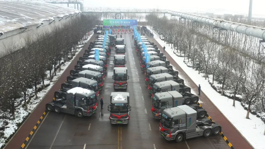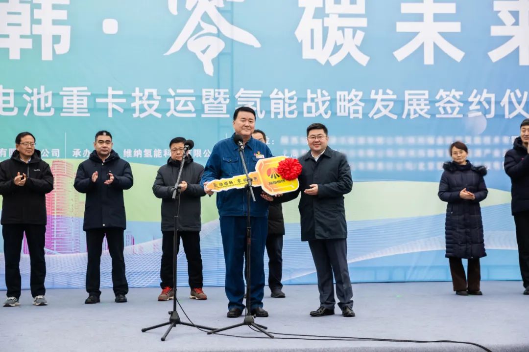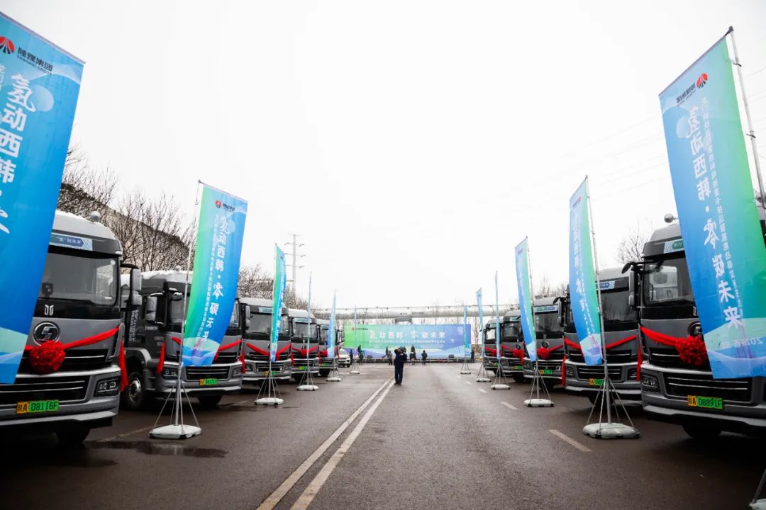 在會場所有領導的見證下,維納氫能執行董事宋琦向陜鋼集團龍鋼公司黨委書記、董事長陳驍交付車輛鑰匙,伴隨韓城市委副書記張景鋒的宣布,33輛重卡鳴笛啟動,以氫能重卡為核心的綠色運輸工作正徐徐展開。