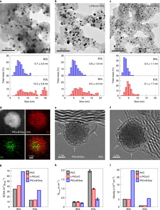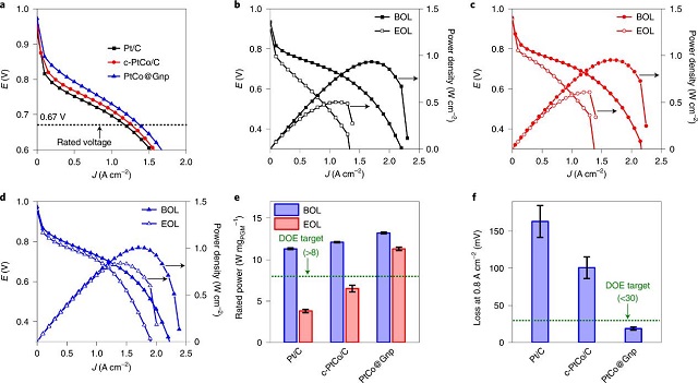 該成果報道了一種由石墨烯納米袋保護的PtCo納米催化劑并應用于質子交換膜燃料電池作為陰極催化劑,由此實現在極具挑戰性的超低鉑載量條件下燃料電池功率密度及耐久性同時達到國際先進水平,預期應用此報道催化劑可將燃料電池汽車所需鉑族金屬(PGM)量降至與內燃機汽車尾氣處理所需相當的水平,這意味著大幅降低燃料電池所需鉑族金屬量,在規模化生產時顯著降低成本,并使其大規模應用不再受限于鉑族金屬極有限的儲量與產量,為進一步推進燃料電池大規模應用鋪墊了道路。本文所報道的工作將是質子交換膜燃料電池大規模推廣的關鍵一步,為該領域重要突破。