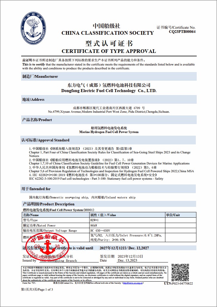 近日,由東方鍋爐所屬子企業(yè)東方氫能自主研發(fā)的船用燃料電池發(fā)電系統(tǒng)獲得中國船級社(CCS)型式認可證書,東方氫能是中國西部首家也是唯一一家獲得中國船級社船用燃料電池發(fā)電系統(tǒng)認可證書的企業(yè),標志著東方鍋爐燃料電池系統(tǒng)設(shè)計和制造能力已滿足中國船級社要求,具備船舶領(lǐng)域應(yīng)用的能力。