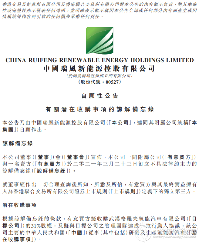 氫能觀察消息:3月23日,瑞風新能源發(fā)布公告稱,其附屬公司與一名獨立第三方賣方簽訂不具法律約束力的諒解備忘錄,擬收購武漢格羅夫氫能汽車31%股權,及擬與該汽車公司管理團隊達成一致行動人協議。根據公告,雙方將于4月30日進行進一步磋商。